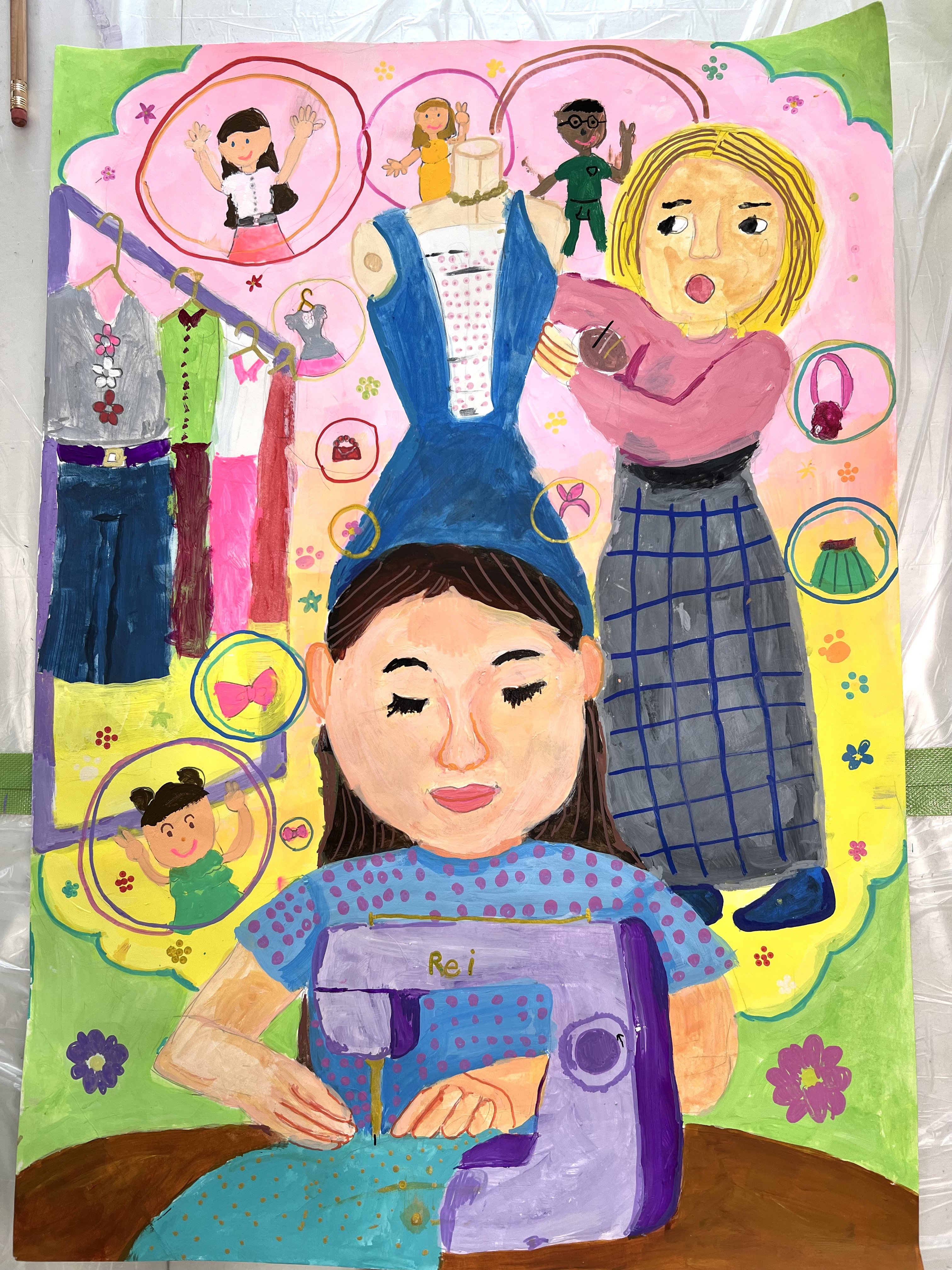 2年生の女の子の絵のテーマは、デザイナーになって世界中のいろいろな子どもたちに自分が作った服をきてもらいたい、ということです。夏休みに一生懸命描きました。素晴らしい賞を頂いて、とてもよい経験になりました。